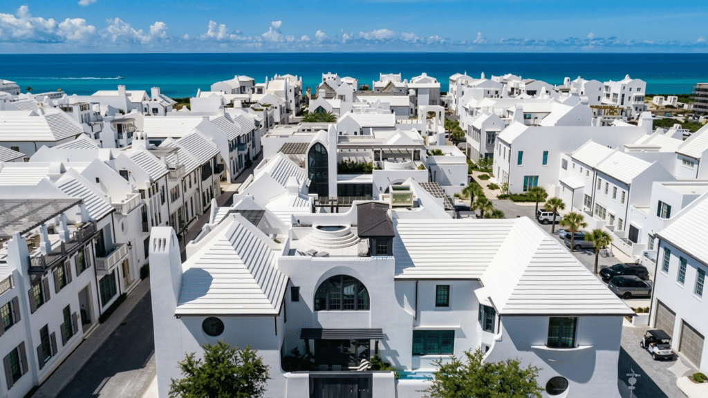 Established in 2004, Alys Beach has gained recognition for its uniform white aesthetic, a departure from the colorful palette commonly associated with Florida beach towns. While many visitors compare its look to Greece, Lane notes that its influences are broader. Design elements draw from Bermuda and Central America, with shaded courtyards reminiscent of Antigua, Guatemala, and stepped roofs designed to collect rainwater. Bermudian-style butteries mark the entrance, while architectural details echo other global traditions.