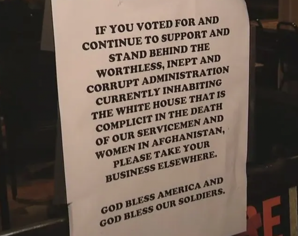 Some Gold Star family members have stated that Biden supporters and Biden voters bear responsibility for the deaths of these servicemembers and the horrors facing Americans in Afghanistan. Therefore, one Florida restaurant owner has said Biden supporters shouldn't bother entering her establishment.