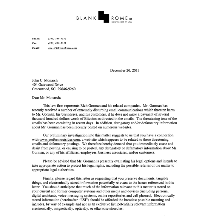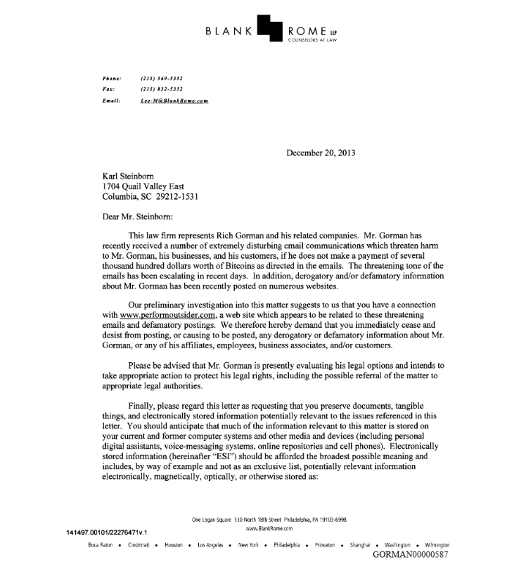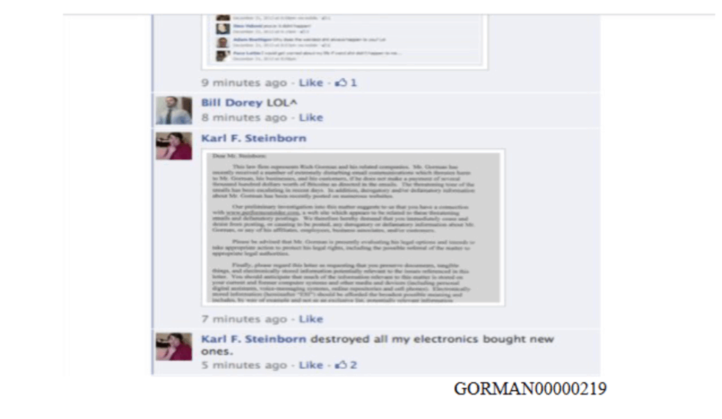 According to Gorman, the attack went on non-stop for over a week until Gorman’s attorneys were able to send out Cease & Desist letters to both Monarch and Steinborn. Thereafter the attacks immediately stopped.