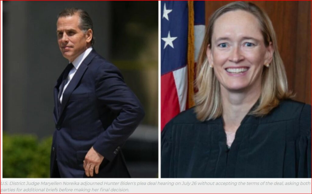 In a dramatic court hearing on Wednesday, the plea deal unraveled in Hunter Biden's criminal case. A federal judge asked questions and raised concerns about the terms of the agreement.  Consequently, Hunter Biden entered a plea of "not guilty" while federal prosecutors confirmed that he is still under federal investigation. Hunter Biden's sweetheart slow-walked deal. Last month, Hunter Biden was charged with two misdemeanor crimes for failing to pay over $100,000 in taxes on an income of more than $1.5 million in both 2017 and 2018. It was anticipated that he would plead guilty after reaching an agreement with prosecutors, who were prepared to recommend two years of probation as part of the deal. However, Judge Maryellen Noreika declined to accept the plea agreement, citing issues with its constitutionality. She offered the prosecution She expressed specific concerns about the unprecedented diversion clause in relation to gun charges from 2018 and requested examples of similar cases where such provisions were offered.