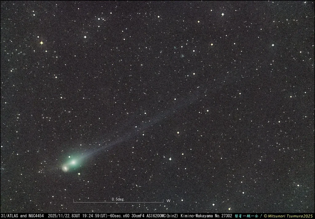 USA HERALD - On November 22, 2025, at 19:25 UTC, astrophotographer Mitsunori Tsumura captured an image of 3I/ATLAS using a half-meter telescope that would spark renewed scientific debate about the true nature of this interstellar visitor. The photograph, taken as the object passed near galaxy NGC4454 in projection, reveals a glowing coma with two distinct features: a tightly collimated tail streaming away from the Sun, and an anti-tail pointing directly toward it.