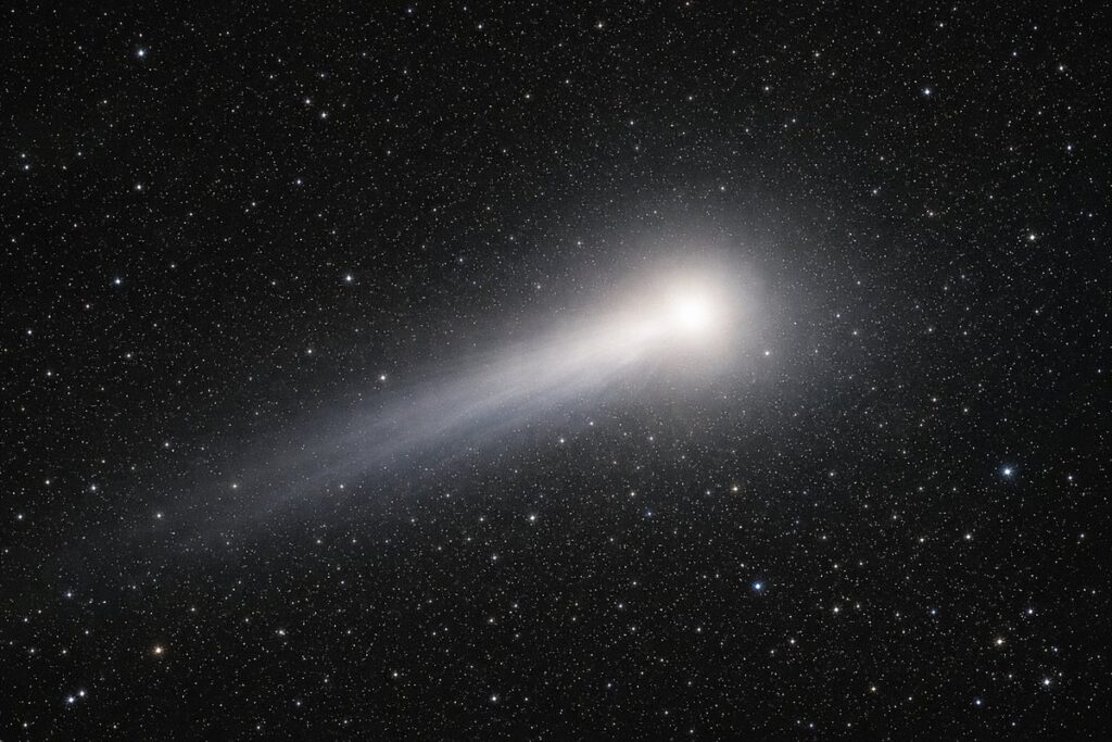 I examined the brightness gradient and coma geometry in this image alongside earlier frames from November and early December. The pattern is consistent. The nucleus remains sharply defined, while the surrounding coma shows a lopsided distribution rather than a smooth, spherical fade. In conventional comet physics, high-velocity outgassing driven by solar heating tends to produce either a more symmetric envelope or clearly defined dust and ion tails aligned with solar and magnetic vectors. Here, the glow remains uneven, suggesting either directional emission, unusual material properties, or a combination of both. This is not proof of anything exotic, but it is evidence that the object is not relaxing into a simple, well-behaved state as it exits the Sun’s influence.